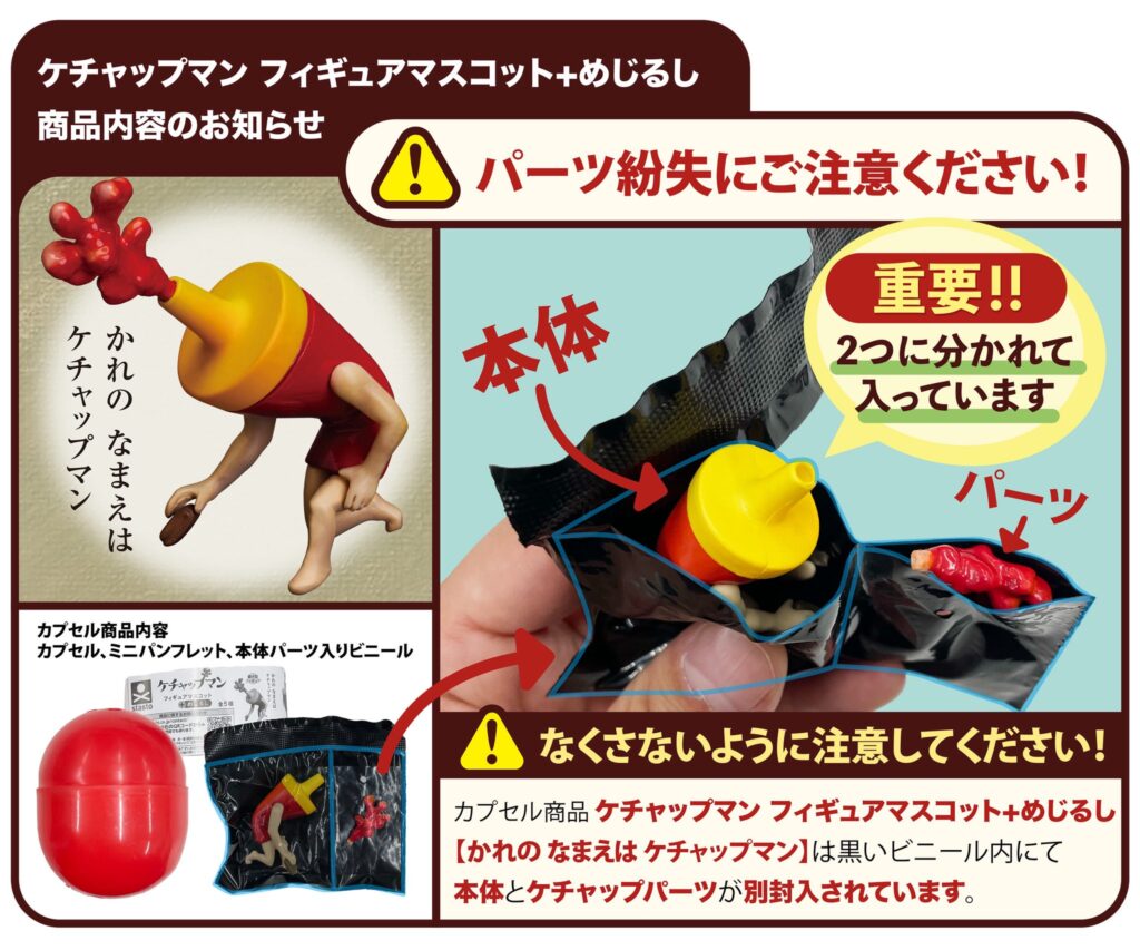【お知らせ】「ケチャップマン フィギュアマスコット+めじるし」をご購入の皆さまへ Posted 2026年4月21日 『かれの なまえは ケチャップマン』という種類のみ、黒い袋の中に本体とケチャップパーツが 別封入されています パーツが見えにくいため、商品を開封の際は、取り残しのないように袋の中身をご確認ください